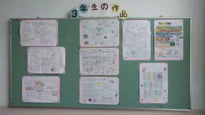 講堂の「作品展」のほかに、調べ学習のまとめなど学年フロアーや階段踊り場掲示板などに飾られています。