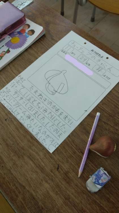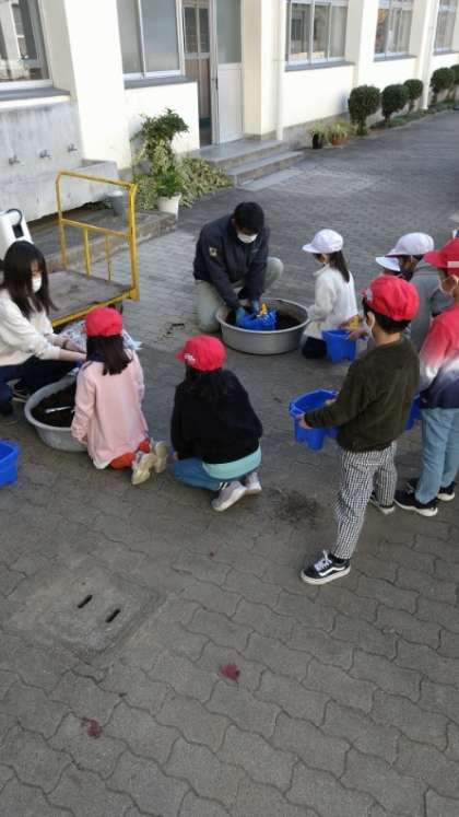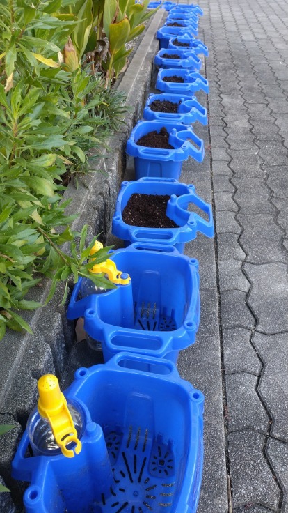 アサガオを育てた植木鉢に、今度はチューリップの球根を植えます。今朝は、管理作業員さんに手伝ってもらって鉢に土を入れました。