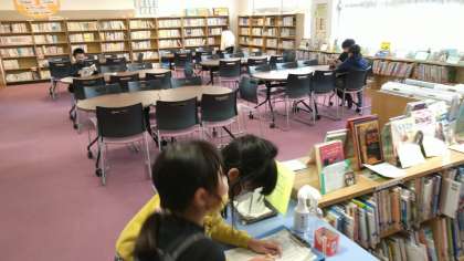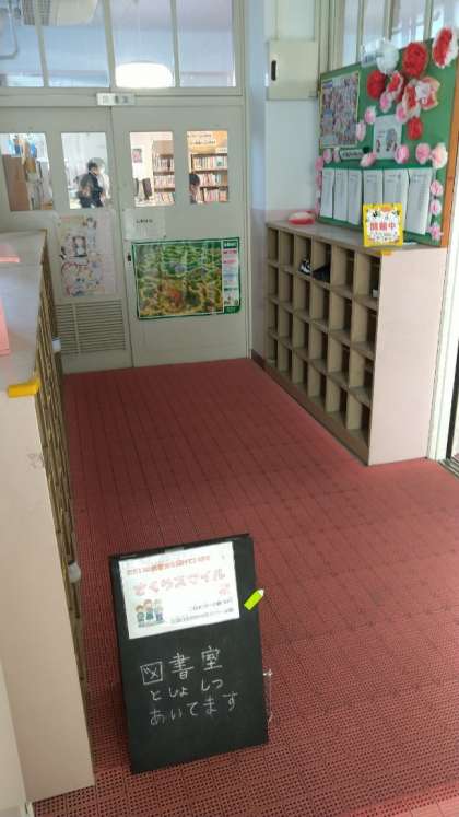 「さくらスマイル」は、地域・保護者の方が行ってくださっている図書室の開館や図書整備、部屋の清掃などのボランティア活動です。昼休みになるとさっそく子どもたちが本を探しにやってきました。