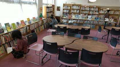 今日は、ちょうど学校図書館補助員さんが整備に来ている日でしたので、学校図書館司書の勉強をされている学生さんたちは、本を手に取り補助員さんに熱心に質問をしていました。