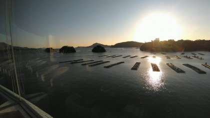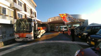 8:05ホテルを出発しました。支配人がふる大漁旗で見送ってくださいました。
