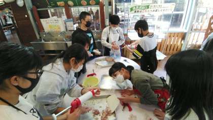 せあぶら、うで肉、スパイス、氷よくまぜてから腸詰め作業です。