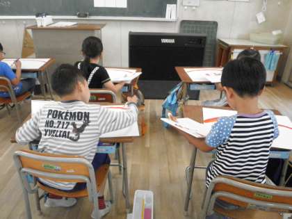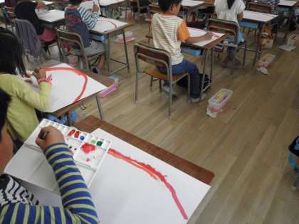 2年生は、絵具を使って絵を初めてかきました。絵具の使い方、筆の洗い方、色の作り方などを張り切って学習していました。
