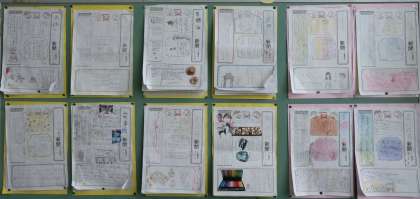 テーマはさまざまで、干支のトラにまつわるものや、お節料理のことなどさまざまでした。階段踊り場掲示板に貼り出しています。