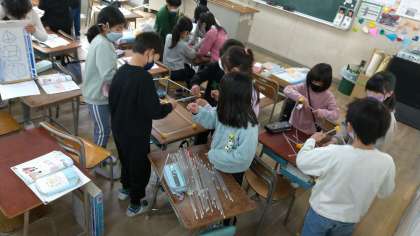 ちょう点に辺をとりつけていくことで、四角の面で囲まれた直方体について学びます。教科書(平面)に図で表された箱と実物の箱を、模型を組み立てる実体験を通して結びつけ理解を深めます。