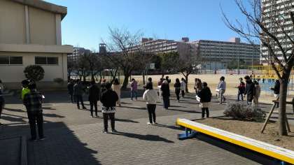 6年生が卒業式にむけての歌唱練習を中庭で行っていました。中庭で行うのは、3密を避けて繰り返し練習をするためです。