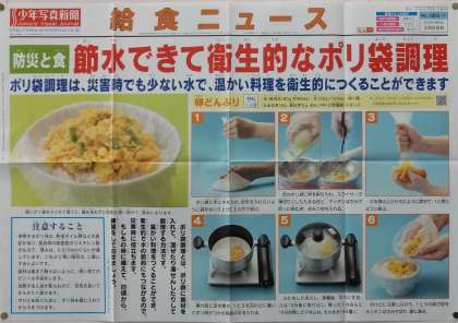 中庭に、かまどベンチを設置しています。給食室横には、少ない水で調理ができる工夫が紹介されていますので見てください。