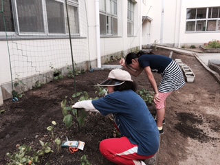 栽培委員会の子どもたちがナスやトマトなどの野菜を植えています。大きく育つように頑張って行きます。
