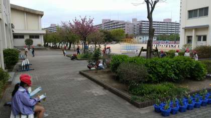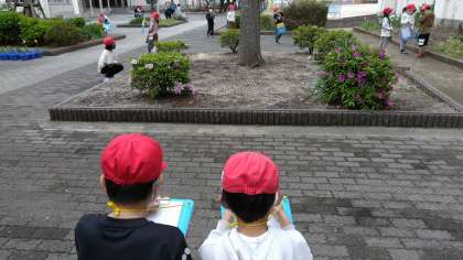 中庭で、春の自然探索です。ダンゴムシを手のひらにのせて観察したり、ツツジの花をスケッチしたりして楽しんでいました。