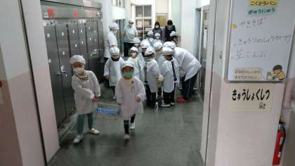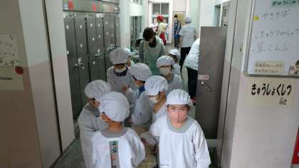 きょうの献立は、みんな大好きヤキソバです。給食室から力をあわせて運びます。