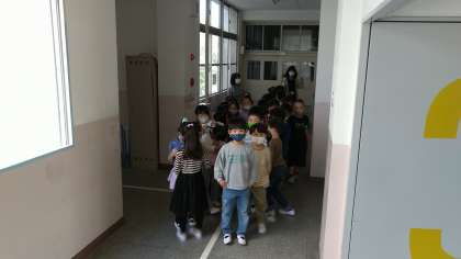 1年生が校内探検をしていました。ちょうど理科室を見ていたようです。授業中なので「忍者になって」(静かに声を出さずに足音もたてずに)行きますよと、引率していました。