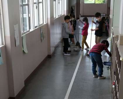 職員室前廊下の清掃を2年生が担当しています。手洗い場のシンクをきれいに洗い流したり、くつばこのほこりをはらったりと、各自の役割をしっかりはたしてくれていました。