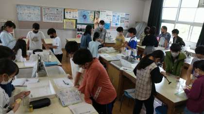気体検知管や石灰水を用いて、ものが燃えたときに発生した気体を調べます。理科室での実験は楽しいですね。