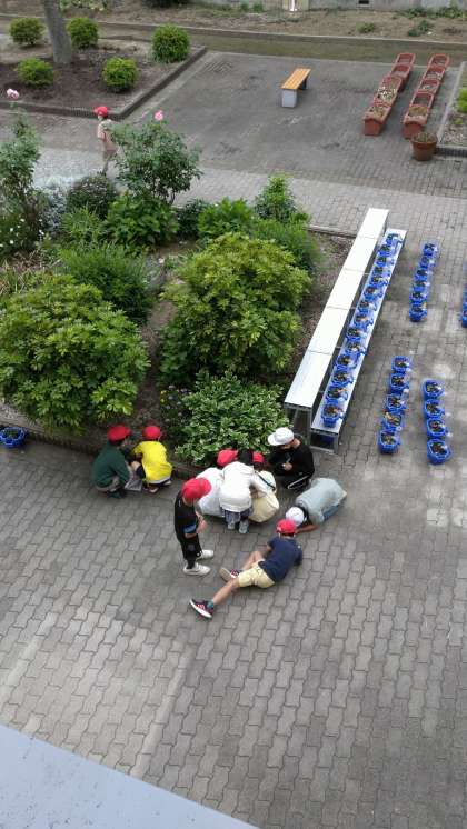 中庭は、理科教材の宝庫です。虫めがねを手に、生き物探しです。