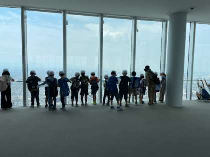 ハルカスの16階で受付をし、60階行きのエレベーターに乗りました。エレベーターでは、そのスピードに歓声が上がっていました。展望台では、東西南北に分かれ、学級ごとに見学しました。少しだけ曇っていましたが、大阪市内のすみずみまで見渡すことができ、大変よい体験になりました。