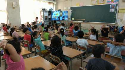 大阪府警本部から来てくださいました。コロナ対応と熱中症予防のため、今年度も放映による交通安全教室です。3学年づつ2グループに分け、それぞれに合わせた内容でお話くださいました。交通にまつわる〇×クイズに答えながら、横断歩道のわたり方などを楽しく学びました。