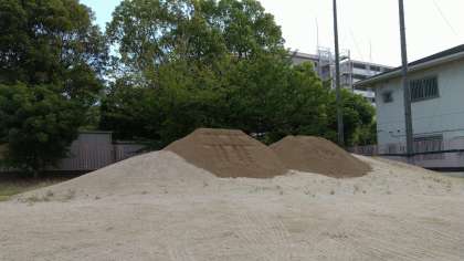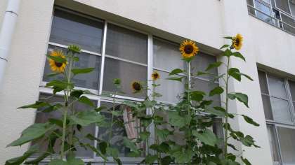中庭のヒマワリは、次々と大きな花をつけています。運動場には山土が搬入され、二上山のようになっています。