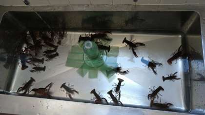 生活科の飼育用にアメリカザリガニが届きました。30匹はいそうです。学級の水そうに移動するまで、手洗いを水そうがわりにして一時待機です。共食いをしないようにたっぷりエサを与えました。