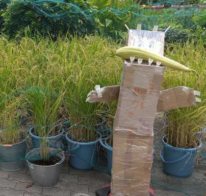 きのう林間学習から帰ってきたばかりの5年生が、今朝、学年で栽培しているバケツ稲の前に案山子を設置しました。