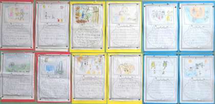 階段踊り場掲示板に飾られていました。いろいろな体験をすることができたようですね。