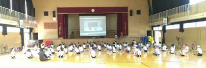 講堂で運動会の練習です。まずは全員でストレッチをして、からだをほぐします。