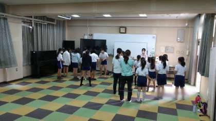 ダンスクラブ:足のステップと手の振付に分かれて、上級生に指導してもらっています。