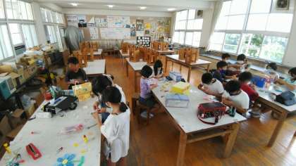 図工クラブ:箱に紙粘土製のマジパンやクッキーなどを貼り付け、お菓子の家を作ります。