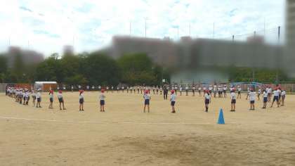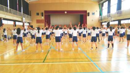 運動場で二重円になるための立ち位置を確認し、3年生と入れ替わりで入った講堂では、鳴子の音が響いていました。