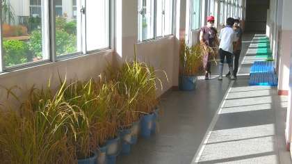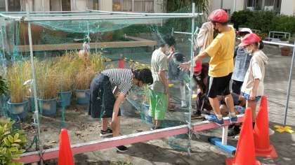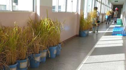 作業をしていた5年生の皆さんに聞くと、「(収穫前の)落水の段階に入っていて、明日にかけて雨予報のため灌水しないように廊下に避難させている」と教えてくれました。