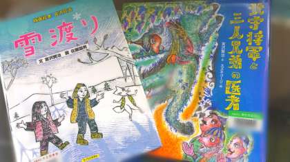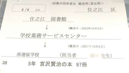 きょうは5年生が国語科の教材用に宮沢賢治の絵本を児童分の冊数借りたものが届いていました。表紙に貼られた管理用タグを見ると大阪市内各所の図書館から集められていることがわかりますね。