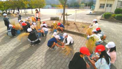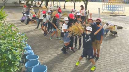 運動会前後の雨から守るため廊下に避難させていたバケツ稲を中庭に運んできました。
