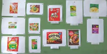 階段踊り場掲示板に飾られていました。作品の絵の一部が本物のパッケージで、その周りに拡がる部分は絵の具で描かれています。本物の部分と描かれた部分の区別がつきますか。