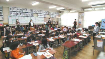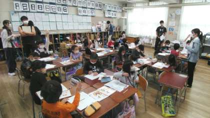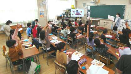 大阪市教育センターからスクールアドバイザーの先生に来ていただき研究授業を行いました。学級担任とは違う先生の授業でしたが、子どもたちは班活動などで自分の考えを発表するなどよく頑張っていました。挙手もたくさんあり、グーのハンドサインは「同意見」だそうです。