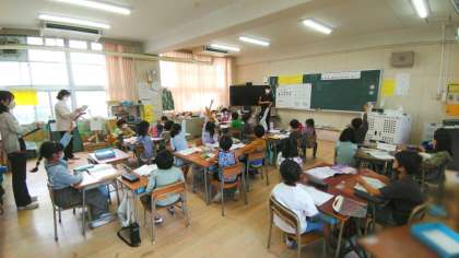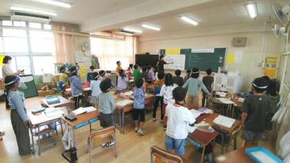 大阪市教育センターからスクールアドバイザーの先生に来ていただき研究授業を行いました。二拍子のリズムを感じながら歌うことをめあてに、曲の感じを話し合いました。「ウン(4分休符)の数が少ないし、タタッ(8分音符の連続)があるから明るい感じ」などの意見が出ました。最後に、リズムと曲の感じを意識して歌いました。