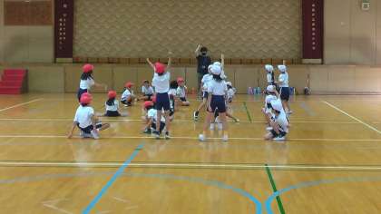 講堂で何が始まるのかな。先生とじゃんけんをしています。楽しそうですね。