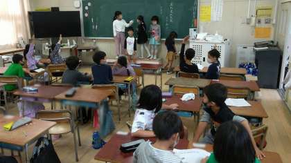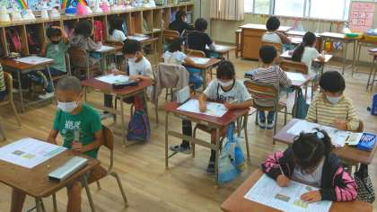 国語のテストプリントをしています。見直しが済んだあとは各々先生に提出します。提出しようかどうかと、まわりの子の様子が気になります。