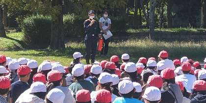 署員の皆さんから「お・は・し・も」のお話をしていただきましたが、子どもたちはしっかりと意識して訓練を行えていました。また、消火器の使い方についても教えてくださいました。
