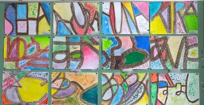 階段踊り場掲示板に飾られていました。デザインされた名前が隠れています。