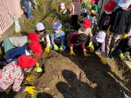 春からみんなで育ててきたさつまいもがとうとう収穫できました。毎日欠かさず水やりをしたり、かかしや柵を作ったりとみんなで話し合い工夫してお世話してきました。