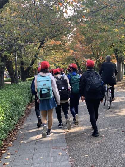先にピースおおさかに行く2学級は、大阪城公園を通って施設に向かっています。紅葉がきれいです。