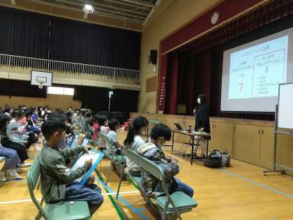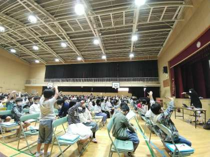 3時間目は、3、4年の部です。メラビアンの法則のお話では、熱心にメモをとる児童の姿もありました。同じ言葉でも声のトーンが違うだけで伝わり方が変わってきます。ハッピーな態度で伝えましょうと、「I Love You」や「最高」などを表す手話をニコニコ笑顔でやってみせます。4年生では、障がい理解の学習で、ちょうど手話を練習し始めたところですので盛り上がっていました。