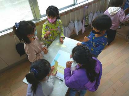 各自の名札にはりつけたことばカードを見て、なかま同士で集まります。自分たちはなんということばでまとめられるか、班で考えました。