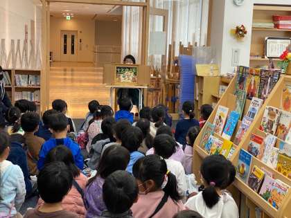 地域にある図書館のポートタウン文庫に見学に行きました。ポートタウン文庫の歴史についてお話をしてもらった後は、紙芝居の読み聞かせをしてもらったり、ハーモニカの演奏を聞かせてもらったりしました。