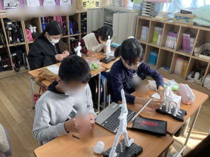 図工作品展に向けて「未来の自分」をテーマに制作しています。針金で骨組みを作り、その上から紙粘土をつけていきます。仕上げには綺麗に絵の具で着色する予定です。