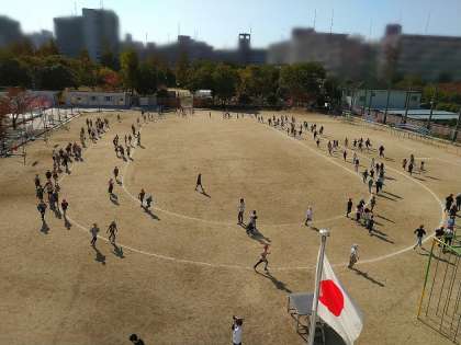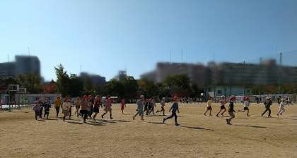 きょうの持久走「走れ走れ」では、2・4年が、各自のペースを時間中維持することに意識してがんばっているようでした。(トラックの内側が2年生です。)この合同練習も、あと1回を残すのみとなりました。