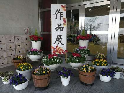 本日よりはじまった懇談にあわせ作品展を開催しています。管理作業員さんが丹精込めて育てた草花の寄せ植えが花を添えます。この時は、4年生が見学をしていました。懇談のあとにでも、ぜひお立ち寄りください。