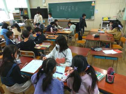 始業式の後は、新学期をスタートするための学級での取組です。写真は4年生ですが、学級係分担を決めた後、係で取り組む内容やメンバー名などを書いた掲示物を作成していました。
