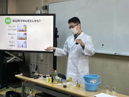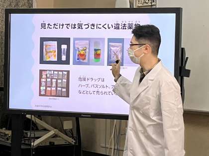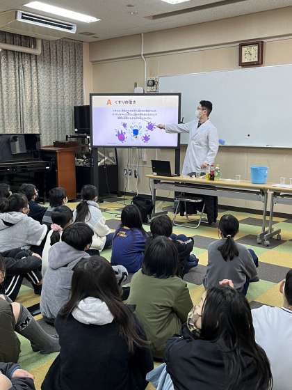 学校薬剤師の先生にゲストティーチャーとしてお越しいただき、お薬教室を開催しました。市販薬や処方薬の正しい服用方法についてや危険な薬物についてなど、実験をまじえながらのわかりやすい授業に子どもたちは熱心に取り組んでいました。