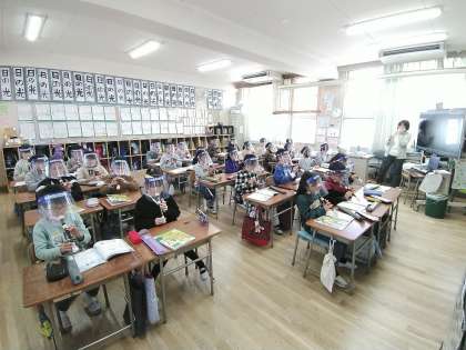 音楽科:フェイスシールドをして飛沫が飛ばないようにしたリコーダーを暗譜で二部合奏します。