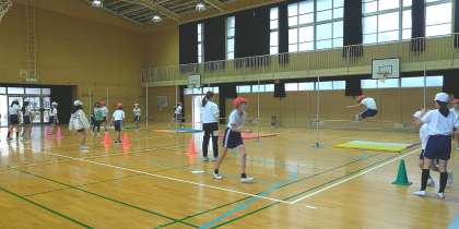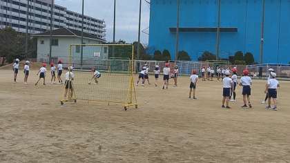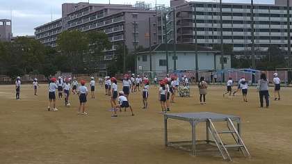 曇天の寒空の下、サッカーの練習をしていました。講堂では、走り高跳びです。